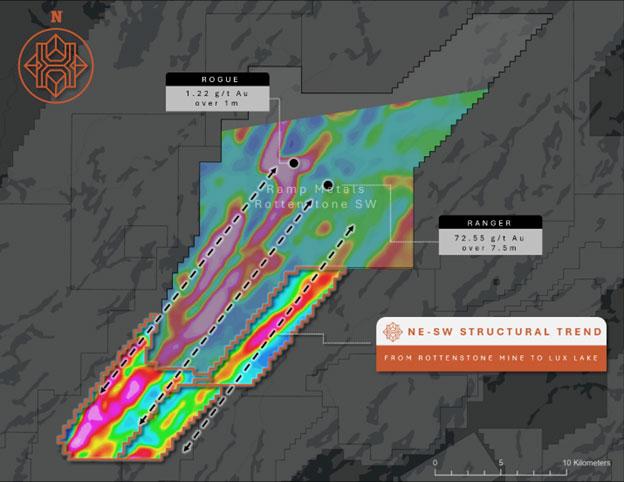 The Property is contiguous to the south-southwest of RAMP Metals Rottenstone SW property (Fig. 1), where exploration resulted in a grassroots discovery hole at the Ranger-01 prospect, which included 73.55 g/t Au over 7.5 m from 227 to 234.5 m depth (see news release dated June 17, 2024, titled: “Ramp Metals Announces New High-Grade Gold Discovery of 73.55 g/t Au over 7.5m at its Rottenstone SW Project”).