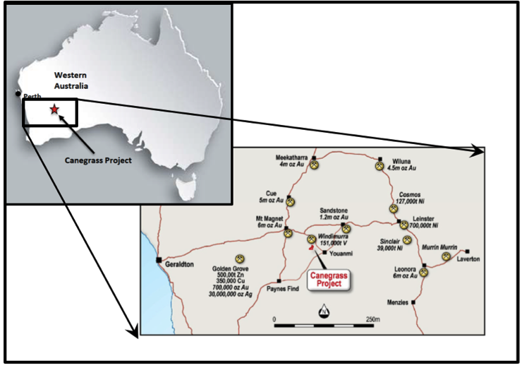 The underexplored 4200 hectare Canegrass Ni-Co-Cu Project, is located ~60 kms SE of Mt. Magnet in Western Australia. The Project is located within the Windimurra Igneous Complex (“Windimurra”), the largest layered mafic-ultramafic intrusive in Australia (see Figure 1), thickest in the world, and geologically similar to the Bushveld Igneous Complex in South Africa.