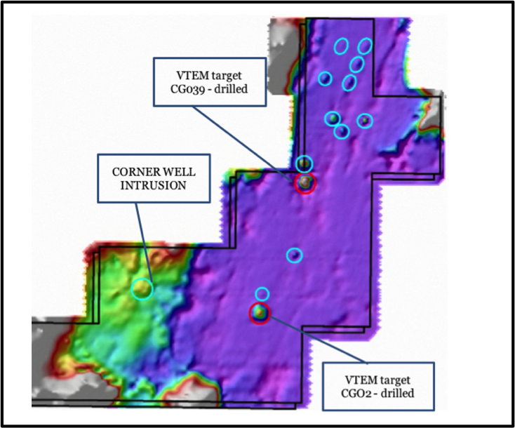- After acquiring property in March 2018, ground EM surveys were initiated in April 2018 at two priority targets (CG02 and CG039), where the previous drilling identified nickel, cobalt and copper close to surface.