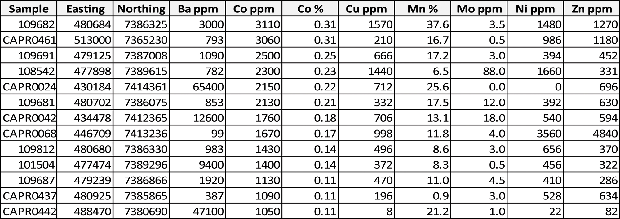 - Historical reconnaissance exploration results (surface rock chip samples) indicate anomalous cobalt grades ranging from trace to 0.311%.