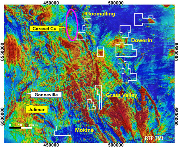 - Recent processing of gravity data at the Gommalling located directly east of Caravel Minerals porphyry copper project have defined coincident gravity and magnetic anomalies with multiple intrusive dykes appearing to extend from a much larger intrusive body.