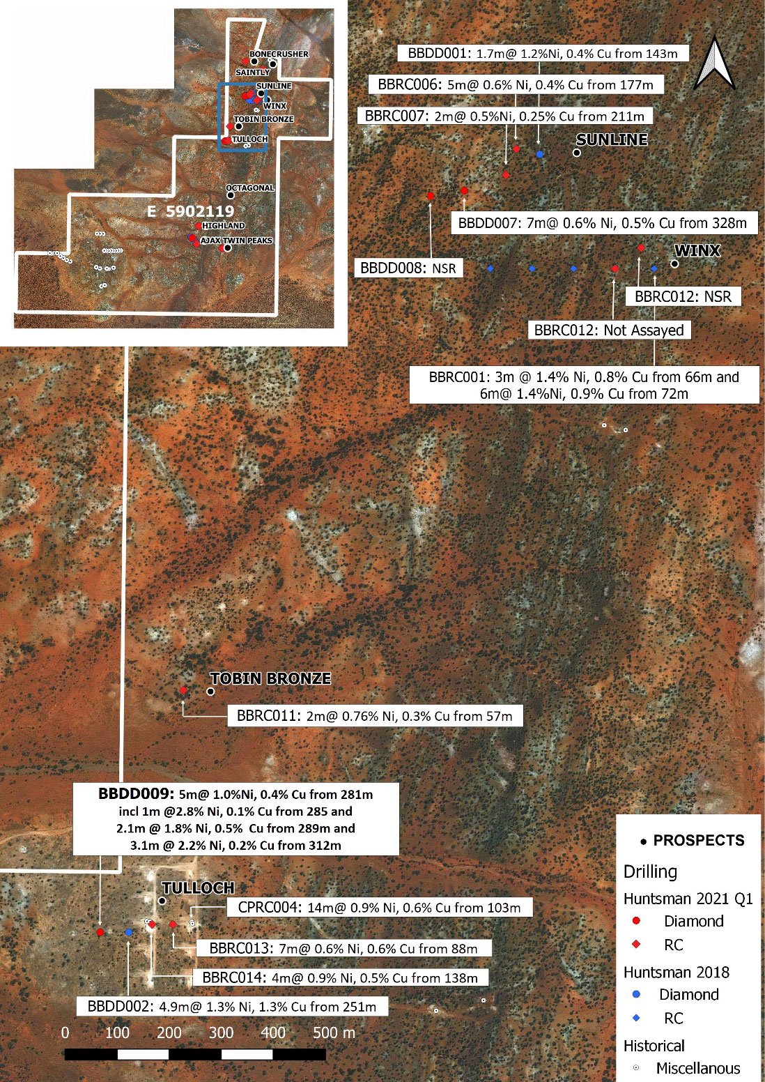 - The Tulloch Ni-Cu zone is open in all directions and now has a total of 5 drill holes along a single east-west fence of drilling (Figure 3). Each hole has encountered various grades of mineralization along 200 m of drilling and down to 300 m in depth. Huntsman will begin to plan step outs to the north and south to further define a strike length of the mineralized horizons within the Wyemandoo Shear zone. It is Huntsman’s belief that intercepts discovered to date should be pursued along the north-south strike of the shear zone and at depth to determine if the targets are linked, or a source of the current mineralized zones is part of a much larger system. Several known Australian Nickel Sulphide producing deposits have been discovered by following mineralization that ultimately led to a feeder system that formed the bulk of those deposits. Huntsman will continue ongoing evaluation of the potential of the Tulloch zone as well as additional targets on the property.