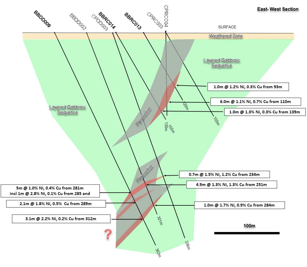 - (Winx BBRC001) 14 m @ 1.17% Ni, 0.88% Cu and 0.05 Co from 65 m, including 1 m of 2.7% Ni, 0.23% Cu and 0.12% Co.